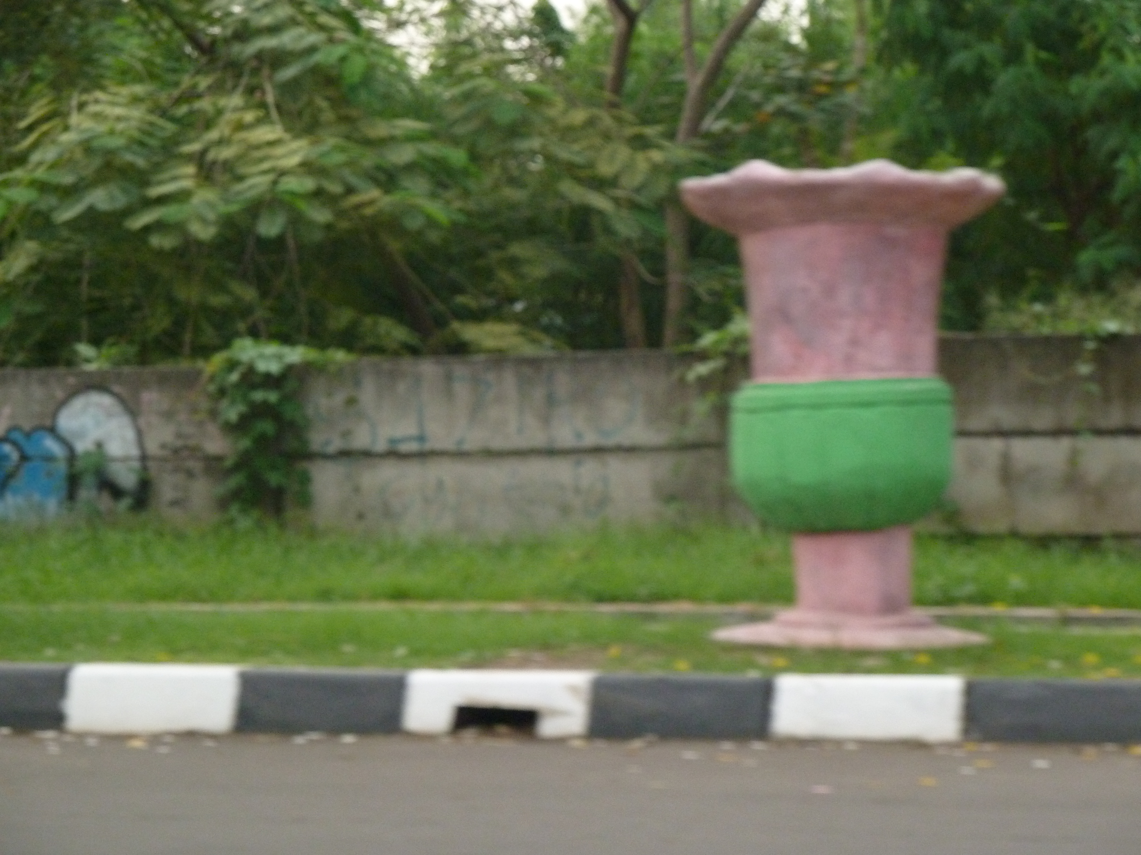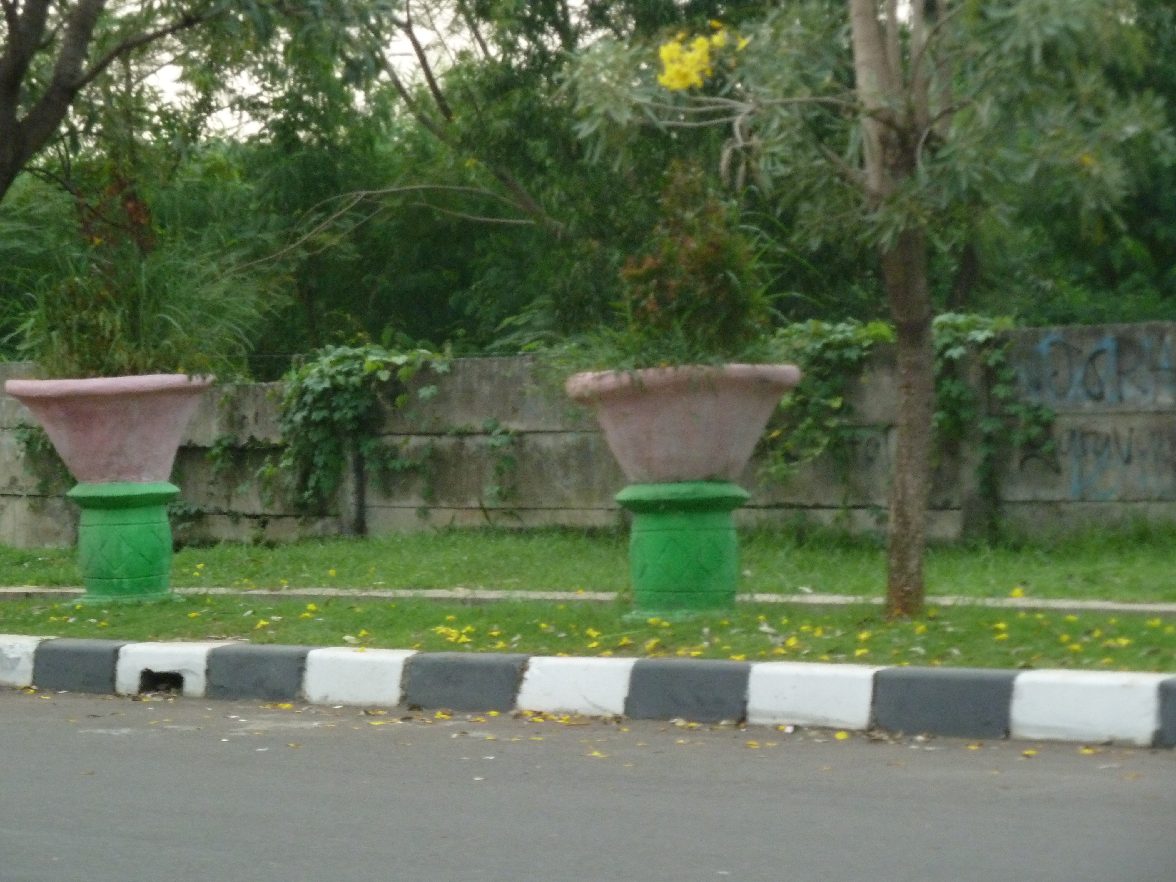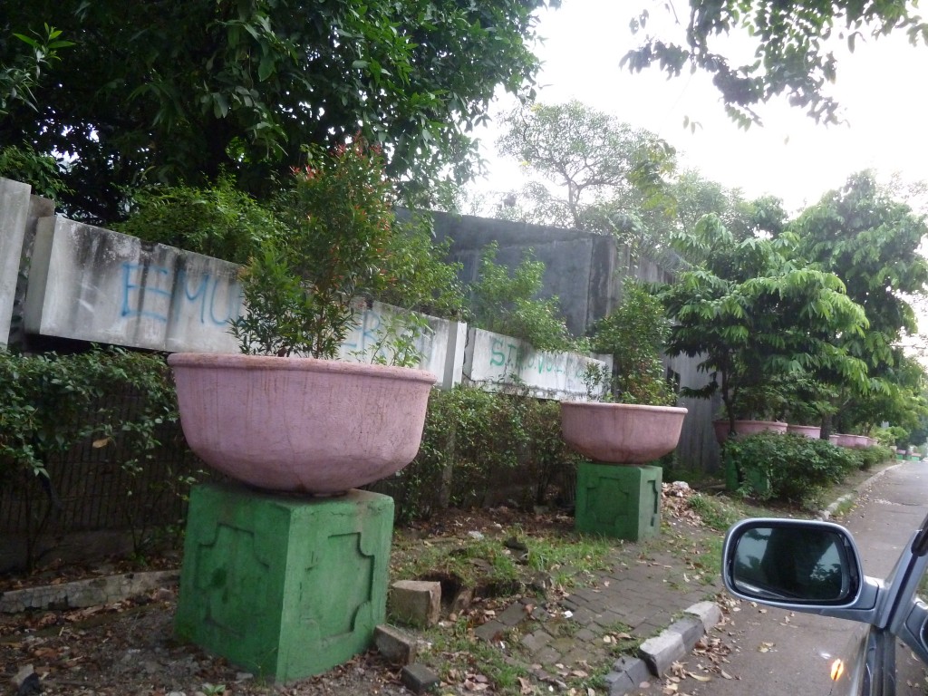 These huge ugly flower pots can be found along the roadsides or on pavements in Jakarta. Usually the plants in them are merely dry twigs. So incredibly impractical and weird. It would be far easier and GREENER to plant trees instead. Anybody listening….